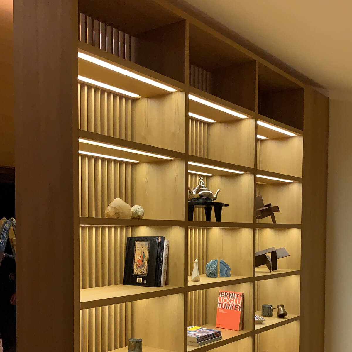 Didim Akbük Koyu'nun cennet yarımadası Kaplankaya'da bulunan Kaplankaya-The Six Senses Villaları için ürettik. Doğal freze meşe kaplamanın kullanıldığı sıra dışı ölçü ve özelliklere sahip vestiyer-seperatör/kütüphane ve konsol, Mimar Gloria Tsai ve Mimar İzgi Yazıcı tarafından istendi. Aydınlatmalı vestiyer kapakları ürün-kullanıcı etkileşimini arttırıyor, benzer özellikteki kütüphane ise giriş ve yemek alanını sepere ediyor, yarı açık ve aydınlatmalı raf sistemi sanatsever kullanıcının objelerini sergilediği bir vitrin haline alıyor. Konsol ise kendi içerisinde yarı transparan depolama alanları sunuyor.